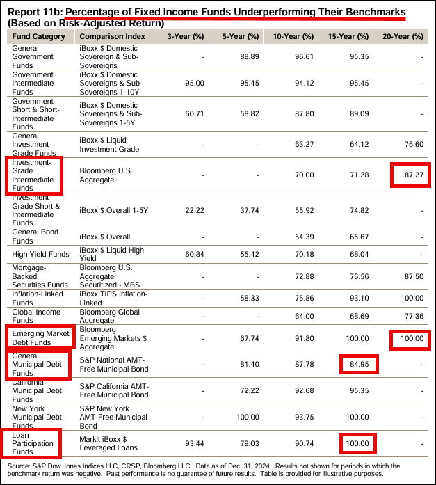 - 85% of muni bond funds and 100% of bank loan funds failed to beat their own benchmarks over the last 15 years.