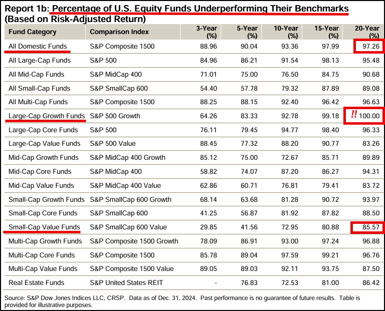 - 85% of small-cap value funds, a favorite sector of mine for its diversification benefits, failed to outperform the passive index for their market.