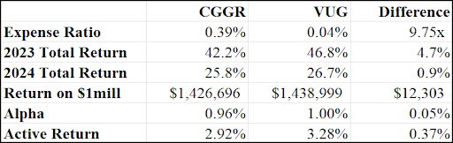 2) Performance: In 2023 CGGR had a total return of +42.2%, while VUG returned +46.8%. That is a difference of 470 basis points in just one year. So far in 2024, CGGR is again underperforming VUG, albeit by only 90bps.