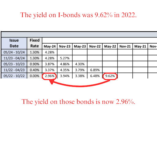 Why? Inflation has come down, and the I-bonds issued during that time had no fixed coupon rate. So the entire 9.62% interest rate that you receive has come down as CPI inflation has cooled.