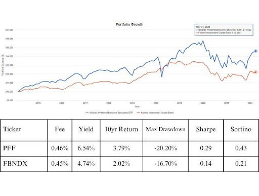 One common preferred stock fund is PFF. It has an expense ratio of 0.46% and a dividend yield of 6.54%. The table below compares 10yr performance and metrics against FBNDX, the Fidelity Investment Grade Bond Fund.