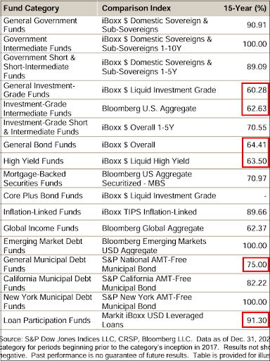 β91% of bank loan funds underperformed their index over the past 15 years, according to the SPIVA report.