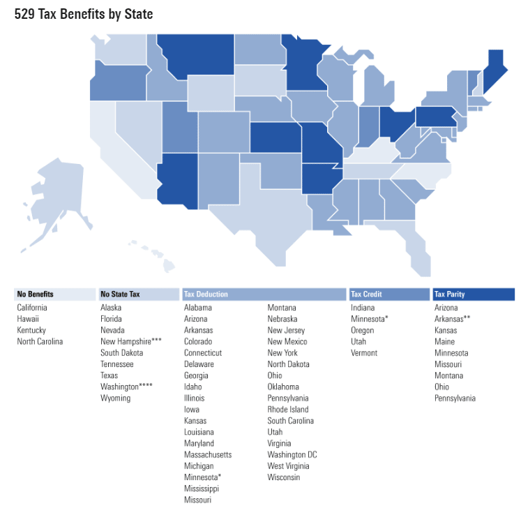 - 529 College Savings Plans: Enjoy tax-free growth and withdrawals, if the money is used for a qualified college expense like tuition, room & board, etc. Also, depending on your state, you may be eligible for a tax deduction this year (see the map below for details).